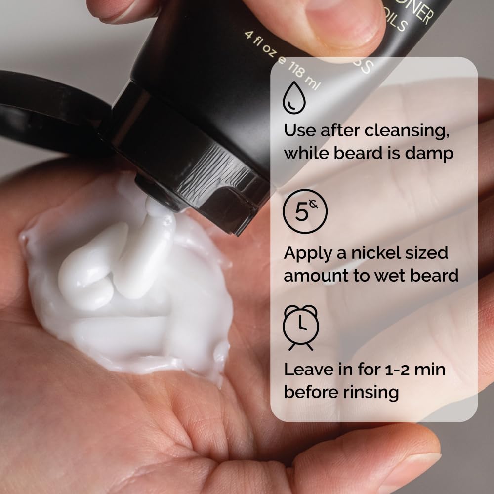 - CONDITIONER USAGE TIP: After rinsing off your beard shampoo, you’re ready for our beard conditioner. Dispense a nickel-sized amount of conditioner into your palms & rub together. Work the conditioner through your facial hair from root to tip. Make sure your skin is lathered up to make sure it’s fully worked into your face. Next, allow the conditioner to absorb (we recommend 2-3 minutes) before rinsing it off your face. You’re good to go as is or finish it up with some beard balm or oil to style.