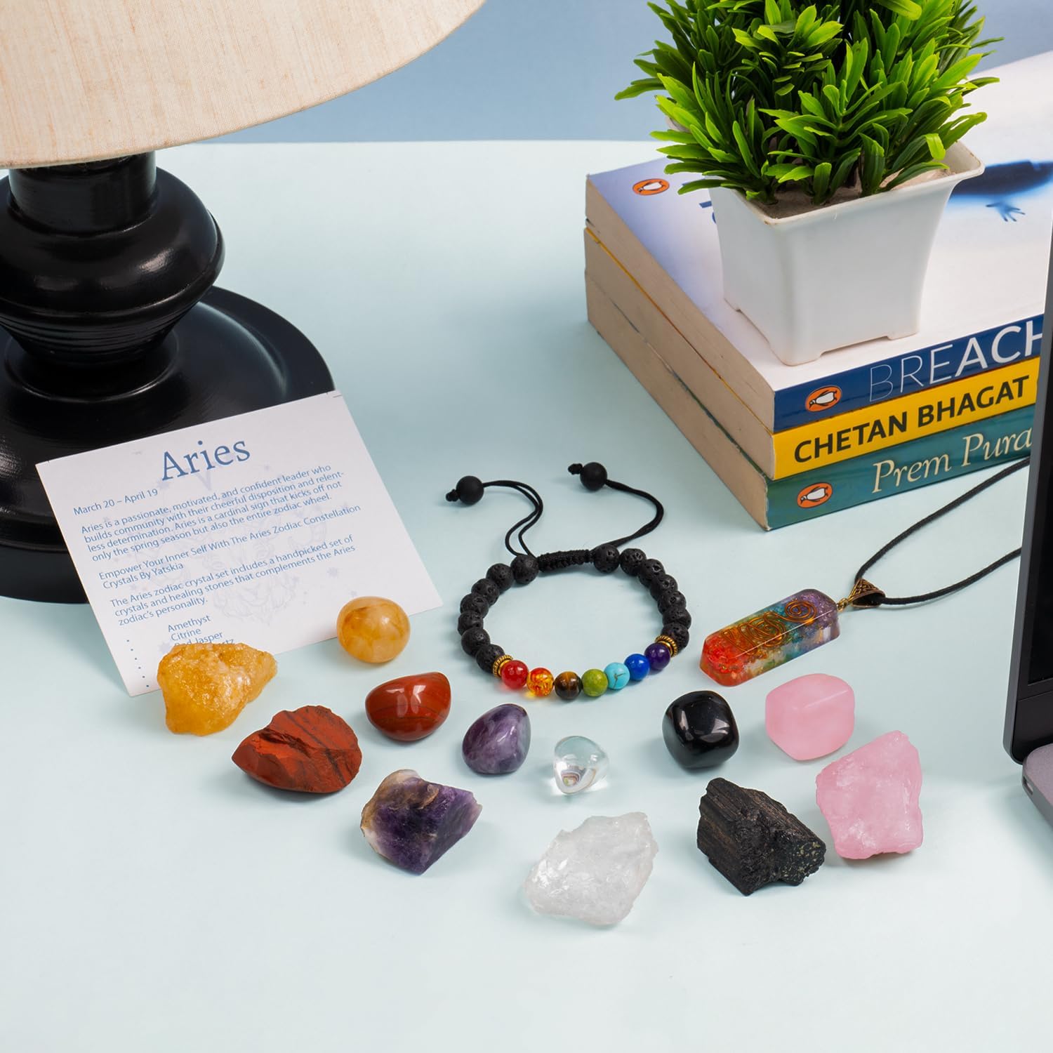- Aries Crystal Set - This zodiac aries healing crystals set contain 6 natural healing rough stones and 6 polished tumble stone with beautiful seven chakra pendant and chakra bracelet. Which are connected to healing and positive energy properties of aries zodiac sign .