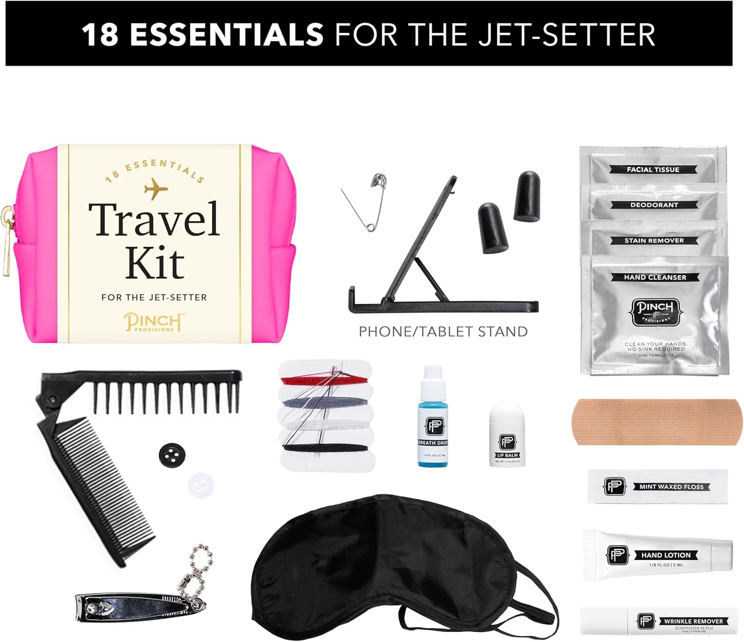 - ALL-IN-ONE TRAVEL ESSENTIALS - The kit comes with 18 travel-friendly things including a mending kit, a safety pin, an eye mask, nail clippers, a phone/tablet stand, facial tissues, and wrinkle remover - everything you need to make your journey comfortable
