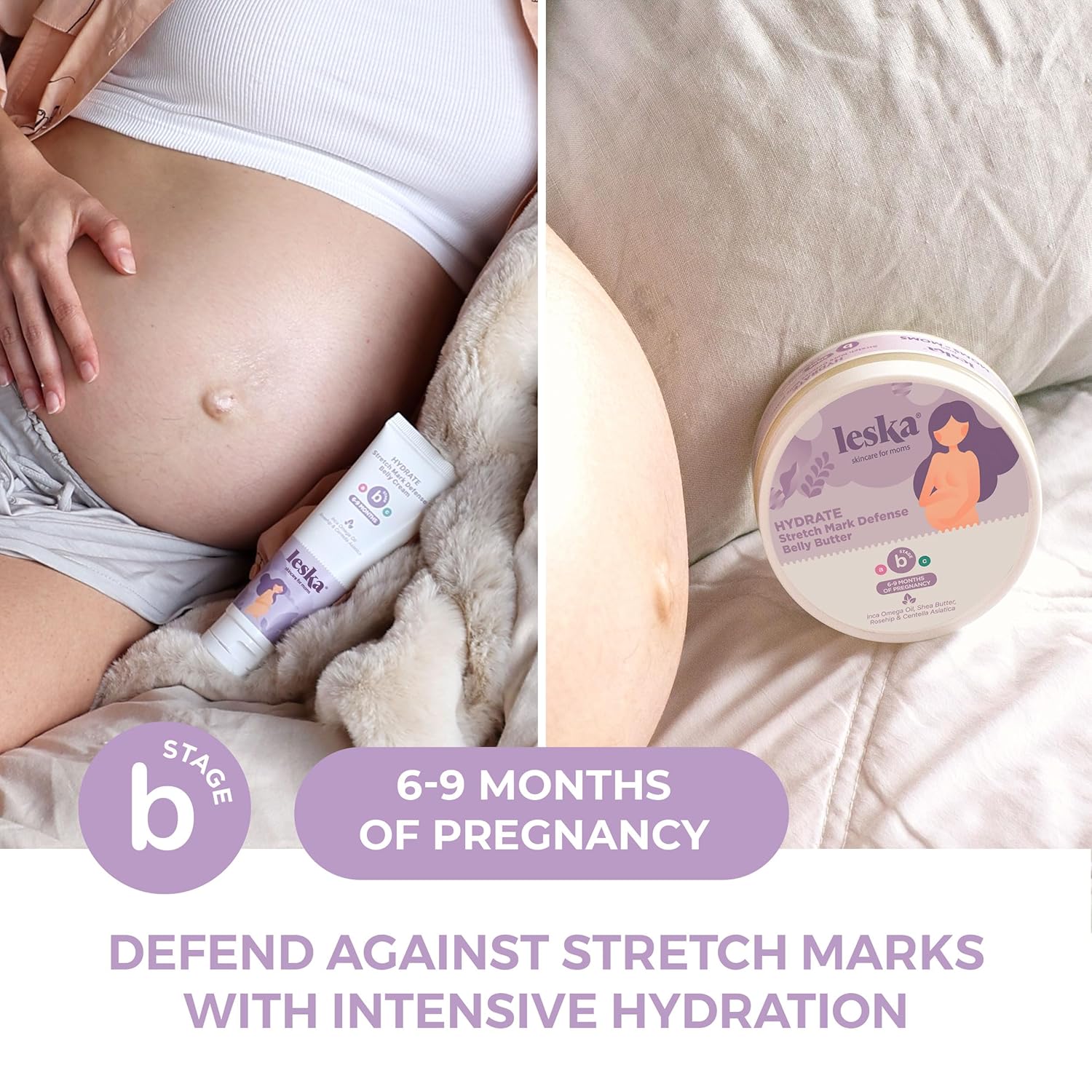 - THE COMPLETE 3 STAGE SYSTEM: Leska’s A-B-C system designed to keep your skin hydrated & glowing.【A】Stage A (months 1-5): Prepare - Prepares your skin for your growing belly.【B】Stage B (months 6-9): Defend - Increases skin hydration to defend your skin against stretch marks.【C】Stage C (Postpartum): Restore - Restores hydration to help your skin snap back.