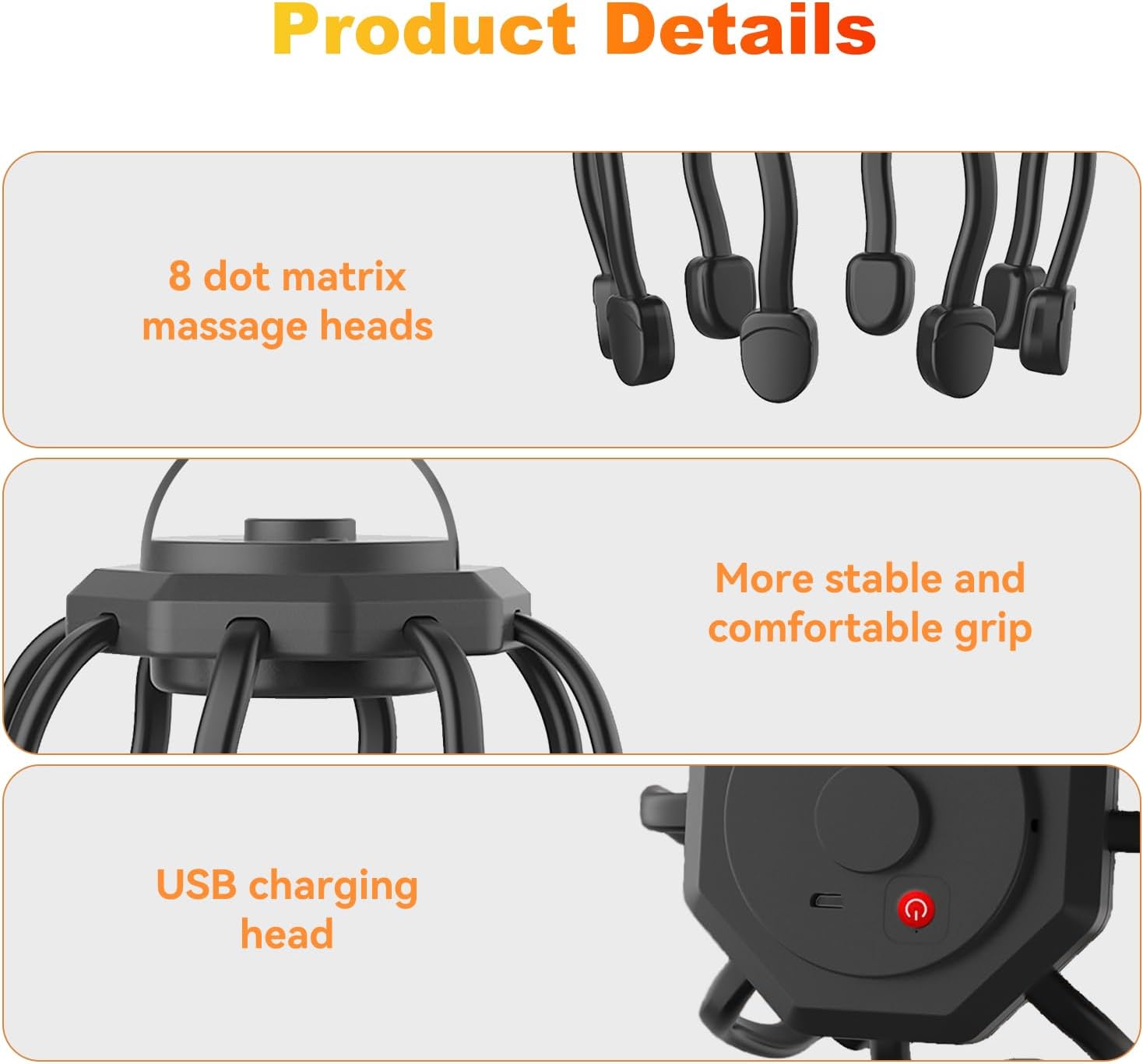 - EXCELLENT CUSTOMER SERVICE & IDEAL GIFT: This product is intended for massage use only; do not use it while charging. If you experience any discomfort during use, please stop immediately. For any questions or concerns about your order, our team is available to assist you within 24 hours. Elegantly presented in a stunning gift box, our scalp massager offers unmatched versatility, making it the perfect gift for your loved ones.