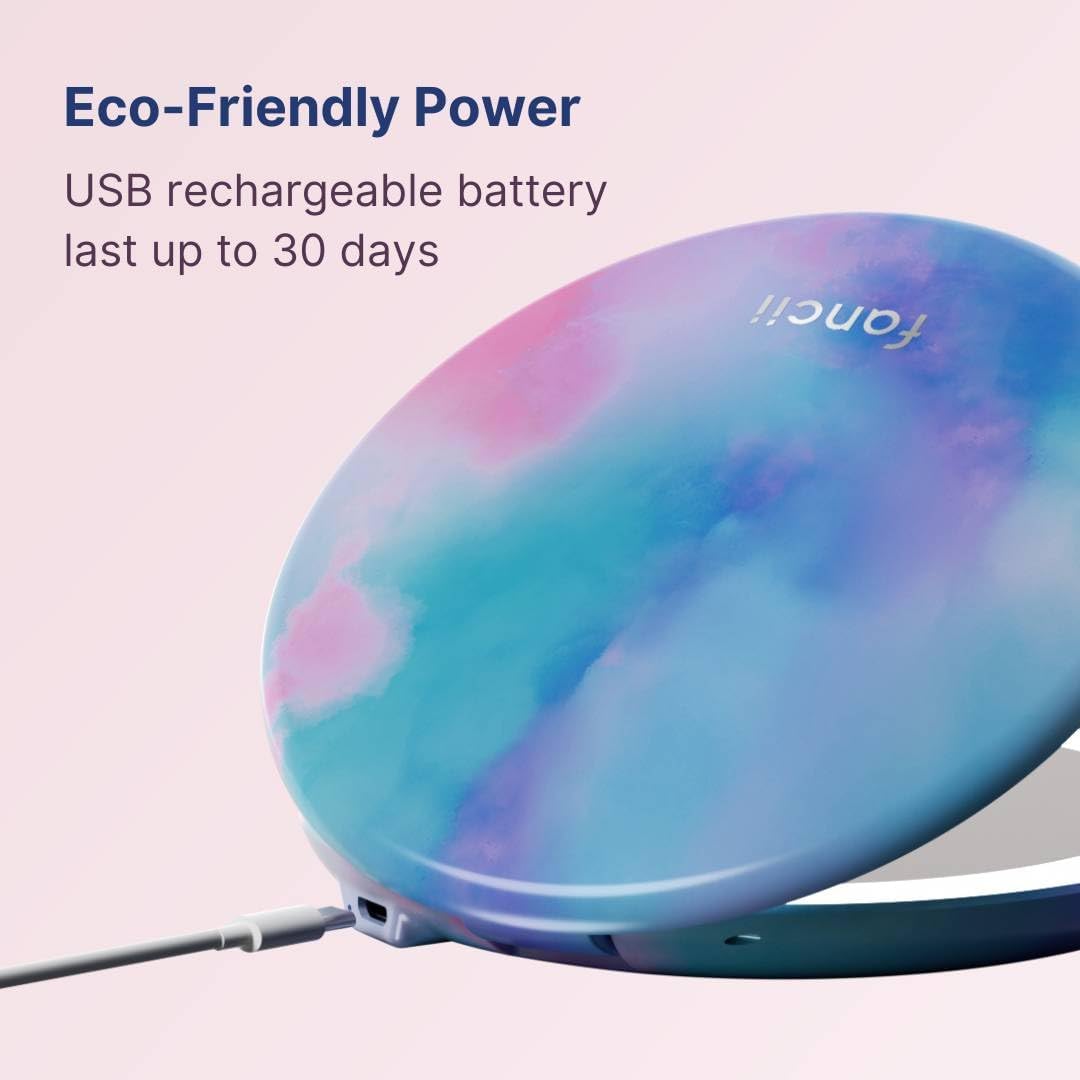 Fancii Taylor Travel Makeup Mirror with LED Light, Rechargeable, 10x /1x Magnifying & 3 Light Settings - Compact, Large 5” Wide Mirror for Handbag and Purses (Lavender Lagoon)